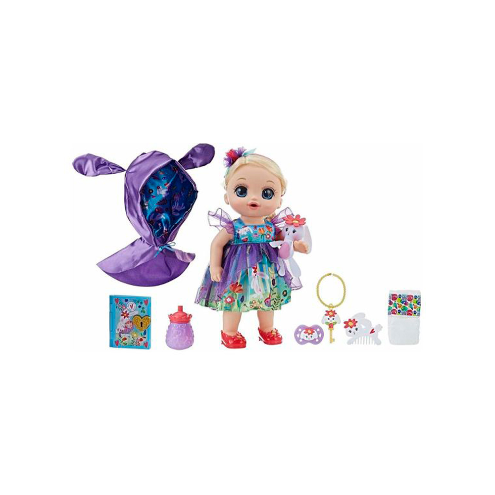 - Conteúdo do kit: Inclui boneca, roupa removível, 1 par de sapatos, capa com capuz, faixa de cabelo, acessório com chave, livro ilustrado, pente, brinquedo de pelúcia, copo, chupeta, fralda e instruções.