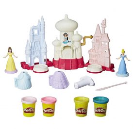 Com o Castelo Reino Brilhante Play-Doh Disney Princesas Bela e Cinderela Hasbro, as crianças podem imaginar diversas aventuras com Play-Doh e as princesas da Disney com este playset que é dividido em 3 castelos diferentes, da Cinderela, da Bella e da Jasmine. É possível fazer e decorar o vestido da Bela e da Cinderela com os moldes e massinhas inclusas. Além de decorar os vestidos dá para criar o tapete mágico do Aladdin com o castelo da Jasmine.