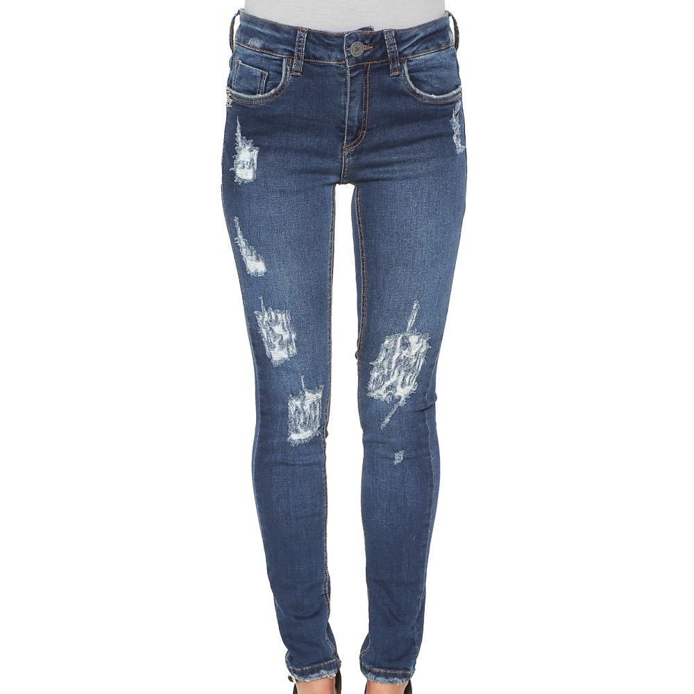 Calça Jeans John John Skinny Destroyed Azul feminina, possui fecho em botão e zíper.