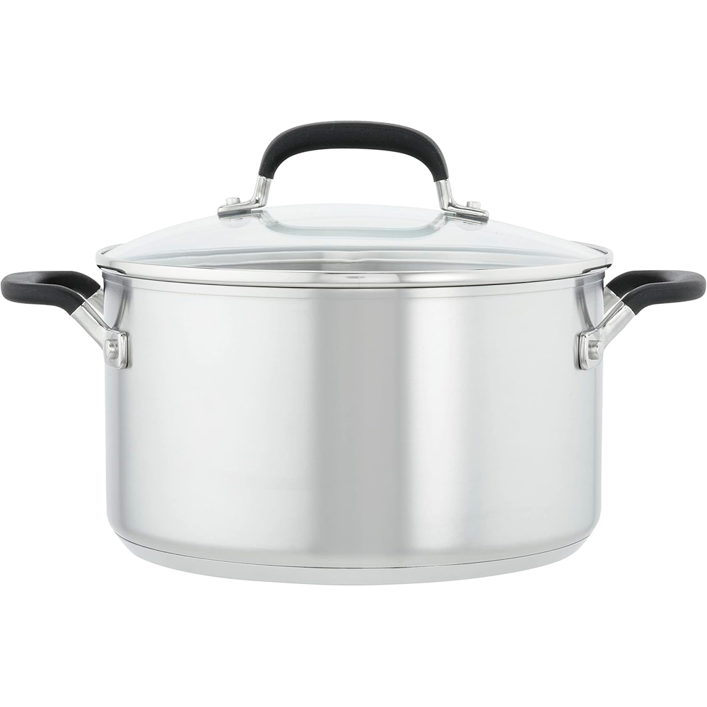 O conjunto de panelas e frigideiras KitchenAid, com 10 peças em aço inoxidável e base de alumínio, proporciona aquecimento rápido e uniforme. As alças em silicone permanecem frias durante o uso, garantindo segurança. Inclui tampas de vidro temperado que retêm calor e sabor, e é fácil de limpar, podendo ser lavado na máquina de lavar louça. Compatível com todos os cooktops, incluindo indução, e seguro para uso no forno a até 400°F. Ideal para quem busca praticidade e eficiência na cozinha.