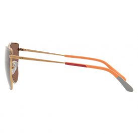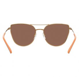 A armação é complementada por lentes com acabamento Castanho Escuro. Este modelo tem formato de olho de gato metálico