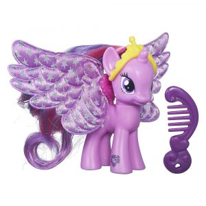 A figura Twilight Sparkles tem um cabelo lindo e asas brilhantes. O pônei tem cabelos longos e coloridos que podem ser estilizados.
