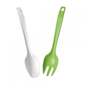 Destrave e use separadamente para lançar: Deslize o garfo 90 ° e levante para separar da colher Trave como uma pinça para servir com uma mão: separe o garfo da colher, vire e prenda novamente, em seguida, deslize para pegar uma pinça Pinças aninhadas para armazenamento conveniente Próprio para máquina de lavar louça