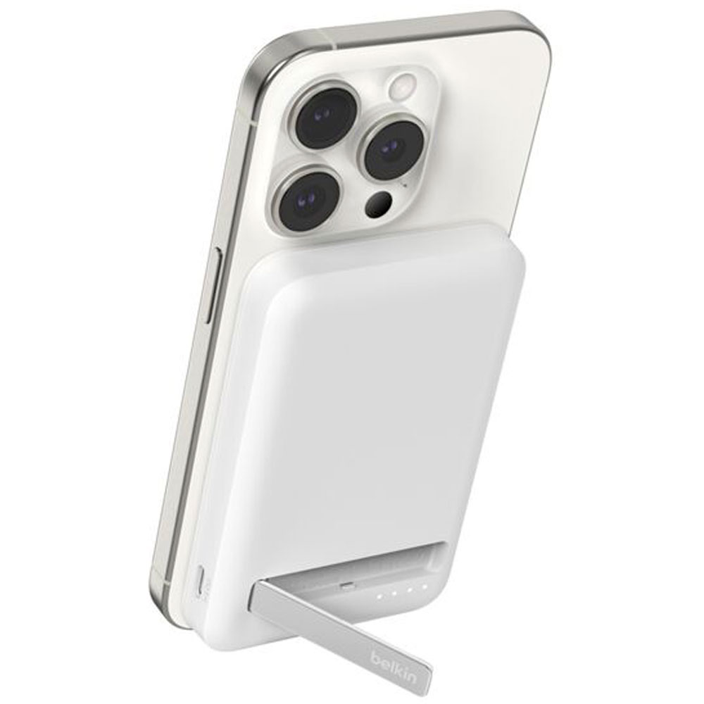 Além do carregamento magnético sem fio, o carregador portátil magnético Belkin BoostCharge Pro 5K também oferece a possibilidade de carregar dois dispositivos ao mesmo tempo por meio da função pass-through, utilizando Wi-Fi e a porta USB-C de forma simultânea. Isso traz muito mais flexibilidade para quem precisa alimentar diferentes aparelhos durante a rotina. O suporte integrado permite manter o iPhone na vertical enquanto carrega, tornando o uso prático para chamadas, navegação ou visualização de conteúdos sem precisar segurar o celular.