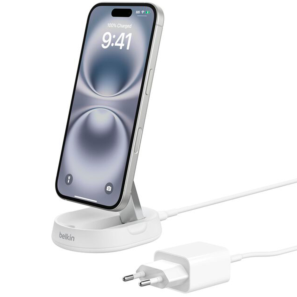 Acompanha fonte de alimentação USB-C de 20W, pronta para uso imediato. O suporte de carregamento Belkin funciona com modelos de iPhone e com os smartphones da linha Samsung Galaxy S25, oferecendo uma solução prática e moderna para manter seus dispositivos sempre carregados.
