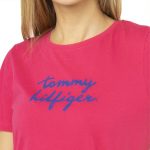 Camiseta feminina Tommy Hilfiger confeccionada em malha 100% algodão, corte básico, costuras internas reforçadas, em especial no pescoço, gola com decote redondo e com a marca na frente.