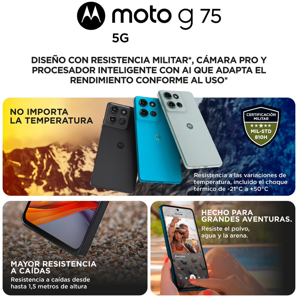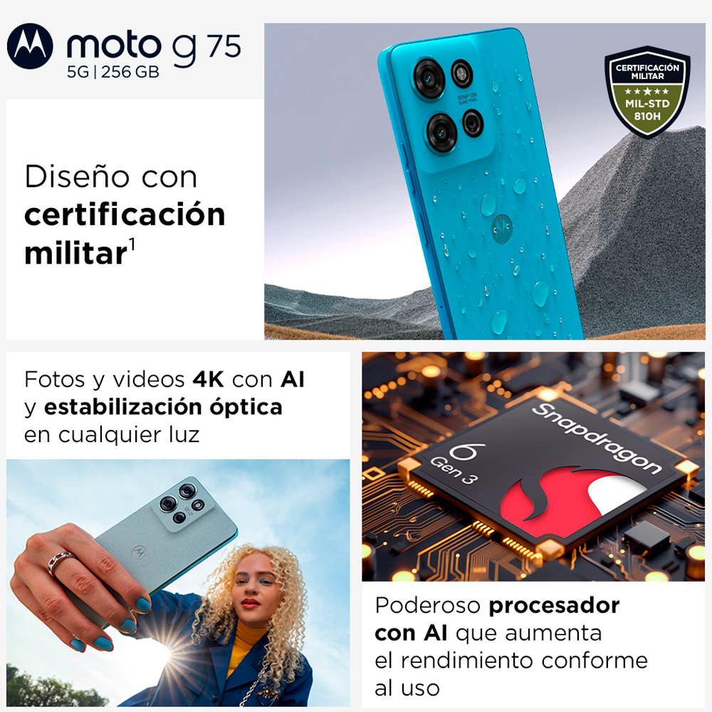 O Motorola Moto G75 5G combina estilo moderno com resistência de padrão militar e proteção IP68 contra água. Possui câmera principal de 50 MP com sensor Sony e tecnologia Quad Pixel para fotos nítidas de dia e de noite. A tela Full HD+ de 6,8″ com brilho alto e som Dolby Atmos garantem uma experiência imersiva. Equipado com processador Snapdragon 6 Gen 3 e RAM Boost, oferece desempenho rápido e fluido. Com bateria de 5.000 mAh e TurboPower 30, você tem energia de sobra todos os dias.