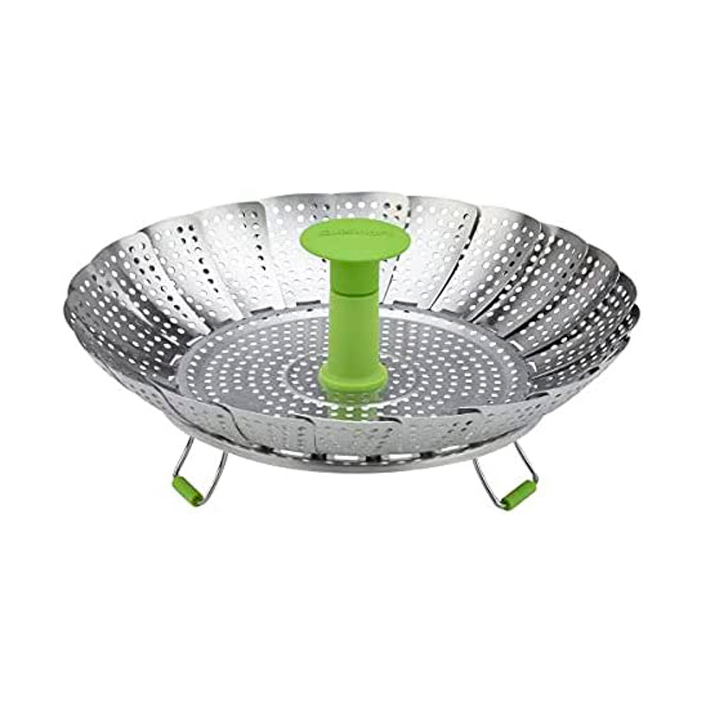 Refeições saudáveis ??no vapor em minutos com o Steamer de aço inoxidável Cuisinart®! Cozinhar a vapor preserva os sabores e texturas mais completos e frescos dos alimentos e bloqueia os nutrientes saudáveis. A cesta de 10,5 polegadas é ajustável para caber em qualquer tamanho de pote e possui pés de silicone e uma alça expansível para remoção fácil e segura.