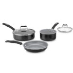 O conjunto de panelas antiaderentes Cuisinart combina praticidade, desempenho e durabilidade em cada detalhe. Feito em alumínio, aquece rápido e distribui o calor de forma uniforme, garantindo resultados consistentes. Seu revestimento antiaderente premium evita que os alimentos grudem e facilita a limpeza. As alças de silicone proporcionam segurança e conforto, enquanto as tampas de vidro permitem acompanhar o cozimento. Versátil, pode ser usado no fogão, forno ou até no congelador.