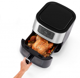 Cinco configurações pré-programadas populares, uma notificação de lançamento para virar os alimentos no meio do cozimento e uma janela de visualização conveniente facilitam fritar, assar, assar, grelhar e aquecer alimentos com resultados deliciosos sempre. Ilumine o seu menu com a prática fritadeira que faz mais na hora das refeições.