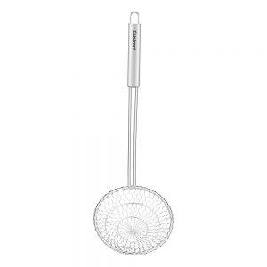 Este filtro grande mantém suas mãos a uma distância segura do óleo quente quando é hora de tirar frango frito, almôndegas e até picles.