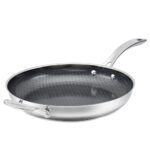 A frigideira de aço inoxidável Cuisinart FPS22-24C oferece aquecimento uniforme graças à base com revestimento de alumínio. Sua superfície PURELYSEAR livre de PFAS combina desempenho antiaderente com excelente poder de selagem. Os reforços em aço inoxidável aumentam a durabilidade e permitem o uso de utensílios de metal. Os cabos Cool Grip permanecem frios ao toque no fogão. Compatível com todos os tipos de fogão e forno, é prática e fácil de limpar.