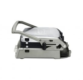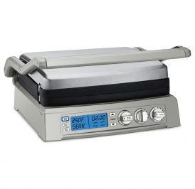 Possui seis funções de cozimento impressionantes em aço inoxidável escovado elegante que brilha em qualquer bancada de cozinha. Este elegante grelhador eléctrico pode realizar qualquer tarefa, com capacidade para grelhar, grelhar, meio grelhar, meio grelhar, prensar panini e derreter sanduíches, carnes e aperitivos. O display eletrônico permite definir um cronômetro e controle de temperatura de zona dupla, o que significa que você pode assar um ovo em um prato enquanto assa bacon no outro, em uma generosa superfície de cozimento de 240 polegadas quadradas.