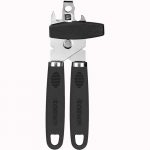 O abridor de latas independente tem uma base extra larga para evitar tombamento, enquanto as linhas limpas do aço inoxidável escovado complementam qualquer outro aparelho de bancada premium para cozinha de chef de luxo.