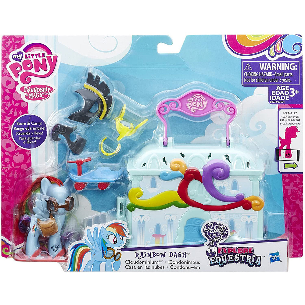 Este conjunto de jogos My Little Pony Friendship é Magic Rainbow Dash Cloudominium é um ambiente divertido para um dia na montanha! Imagine Rainbow Dash se tornando esportivo e ativo com a scooter e acessórios de esqui e, em seguida, passar a noite no Cloudominium! O conjunto de brinquedos Cloudominium vem com uma figura Rainbow Dash e 8 acessórios divertidos, incluindo um capacete Mohawk e óculos de proteção, e se dobra em um estojo de transporte para armazenamento e diversão para levar. Digitalize o código do pônei para desbloquear mais diversão no aplicativo My Little Pony Friendship Celebration.
