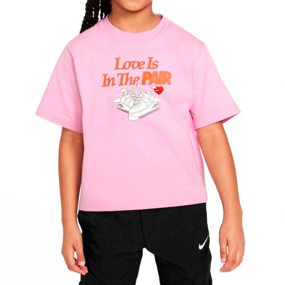 Apresentamos a camiseta Nike infantil feminina, perfeita para o dia a dia da sua filha. Com um corte clássico, mangas curtas e gola redonda, é feita de 100% algodão, oferecendo conforto e liberdade de movimento. Em um tom rosa suave, possui o slogan “Love is in the Pair” no peito. Ideal para uso casual em diversas ocasiões.