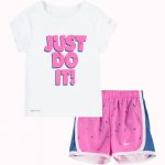 O conjunto de camisetas e shorts Nike inclui uma camiseta e shorts combinando para uma roupa fácil e cotidiana com a qual sua filha pode brincar confortavelmente.