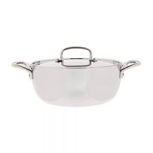 Os utensílios de cozinha de aço inoxidável Contour são utensílios de cozinha premium com construção profissional – um disco de alumínio na base é colado a um interior de aço inoxidável e um exterior de aço inoxidável – uma fusão dos melhores materiais para cozinhar, oferecendo desempenho inigualável. A base encapsulada em alumínio mantém a distribuição uniforme do calor, eliminando os pontos quentes. As superfícies de cozimento em aço inoxidável premium não reagem com os alimentos nem alteram os sabores naturais. Um estilo elegante e uma silhueta robusta criam uma aparência profissional – cozinhe com um toque adicional com esta panela exclusiva!