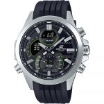 Obtenha conectividade de smartphone e muito mais com um relógio EDIFICE de combinação analógico-digital, projetado para exibir velocidade e inteligência. O design ousado e sofisticado apresenta um bisel octogonal que evoca as linhas das ferramentas de um mecânico de carros de corrida. Este relógio não só chama a atenção, mas também oferece funcionalidade completa para que você possa obter todas as informações de que precisa nas mãos de fácil leitura e na tela LCD. Sincronize com seu smartphone via Bluetooth® para um controle de tempo preciso, onde quer que você vá. Basta tocar no aplicativo para gerenciar facilmente as funções, como selecionar uma cidade da lista de Horário Mundial. O grande mostrador integrado na posição das 4 horas possui um indicador de velocidade que mostra as velocidades médias ao cronometrar voltas para distâncias estabelecidas. A luz LED totalmente automática ilumina o mostrador e a tela LCD apenas inclinando o pulso. Tough Solar carrega o relógio com luz solar ou mesmo com luz de uma lâmpada fluorescente.