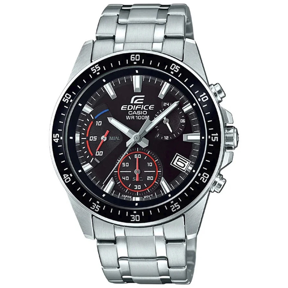 Este é o cronógrafo EDIFICE de tamanho médio, com design esportivo em vermelho e azul. Feito de aço inoxidável, resistente à água até 100 metros e com bateria de 3 anos. Possui precisão de ±20 segundos por mês, com cronometragem analógica e exibição de data.