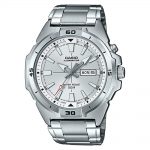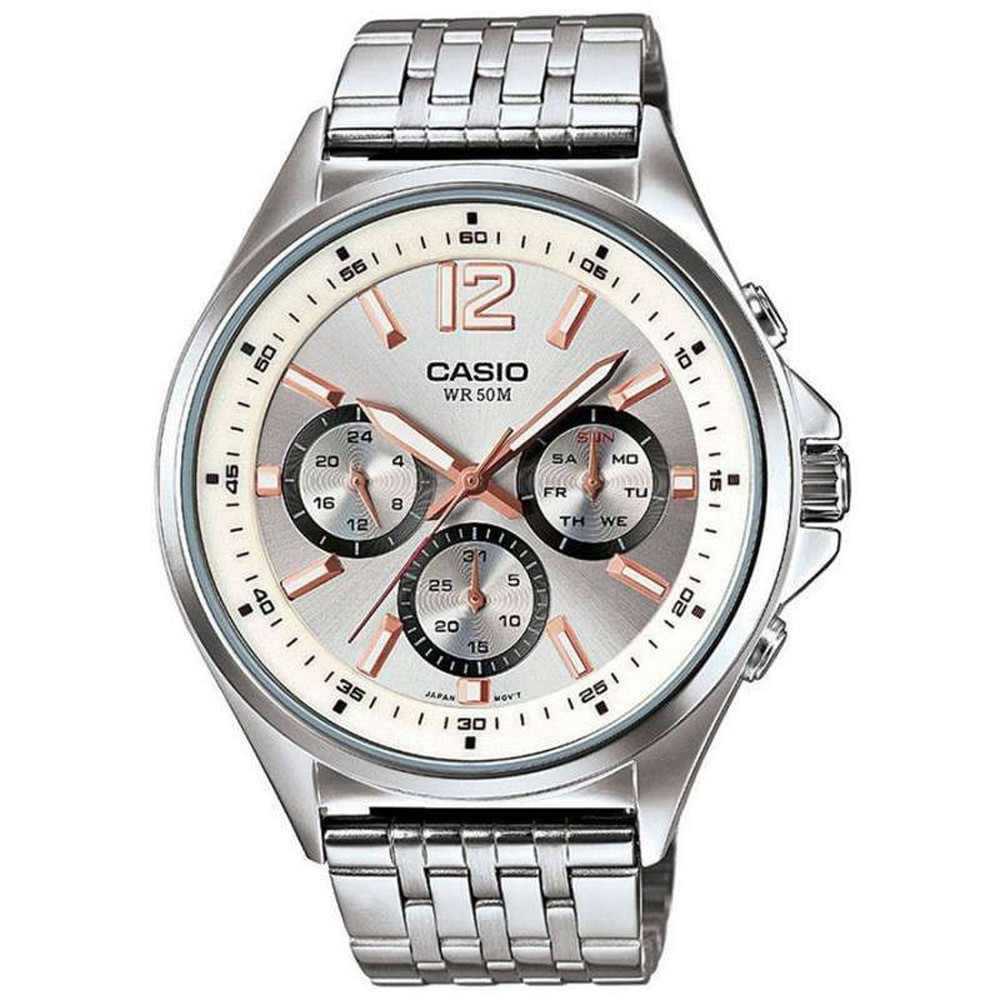 Vidro mineral. Resistência à água de 50 metros. Material da caixa / moldura: aço inoxidável. Banda de aço inoxidável. Fecho triplo de um toque. Horário analógico regular: 3 ponteiros (horas, minutos, segundos). 3 mostradores (data, dia, 24 horas). Precisão: ± 20 segundos por mês.