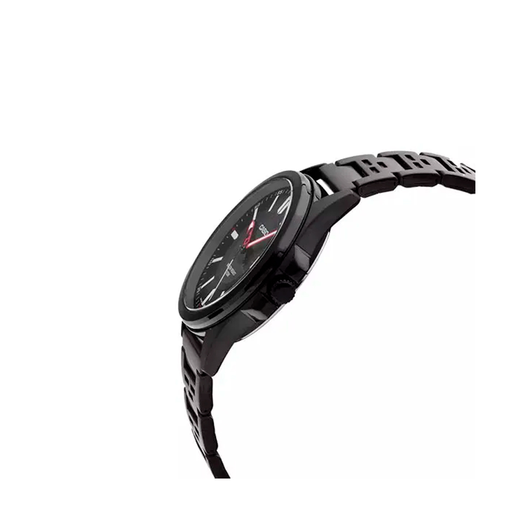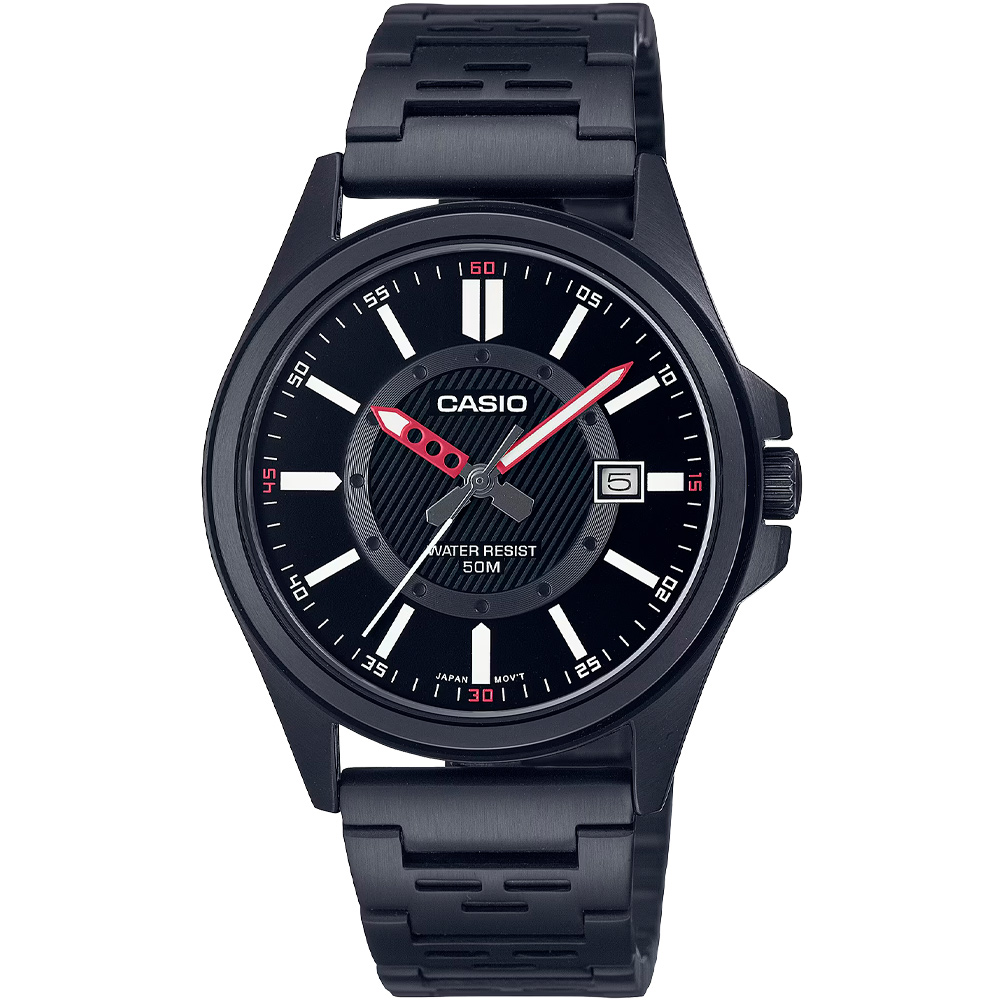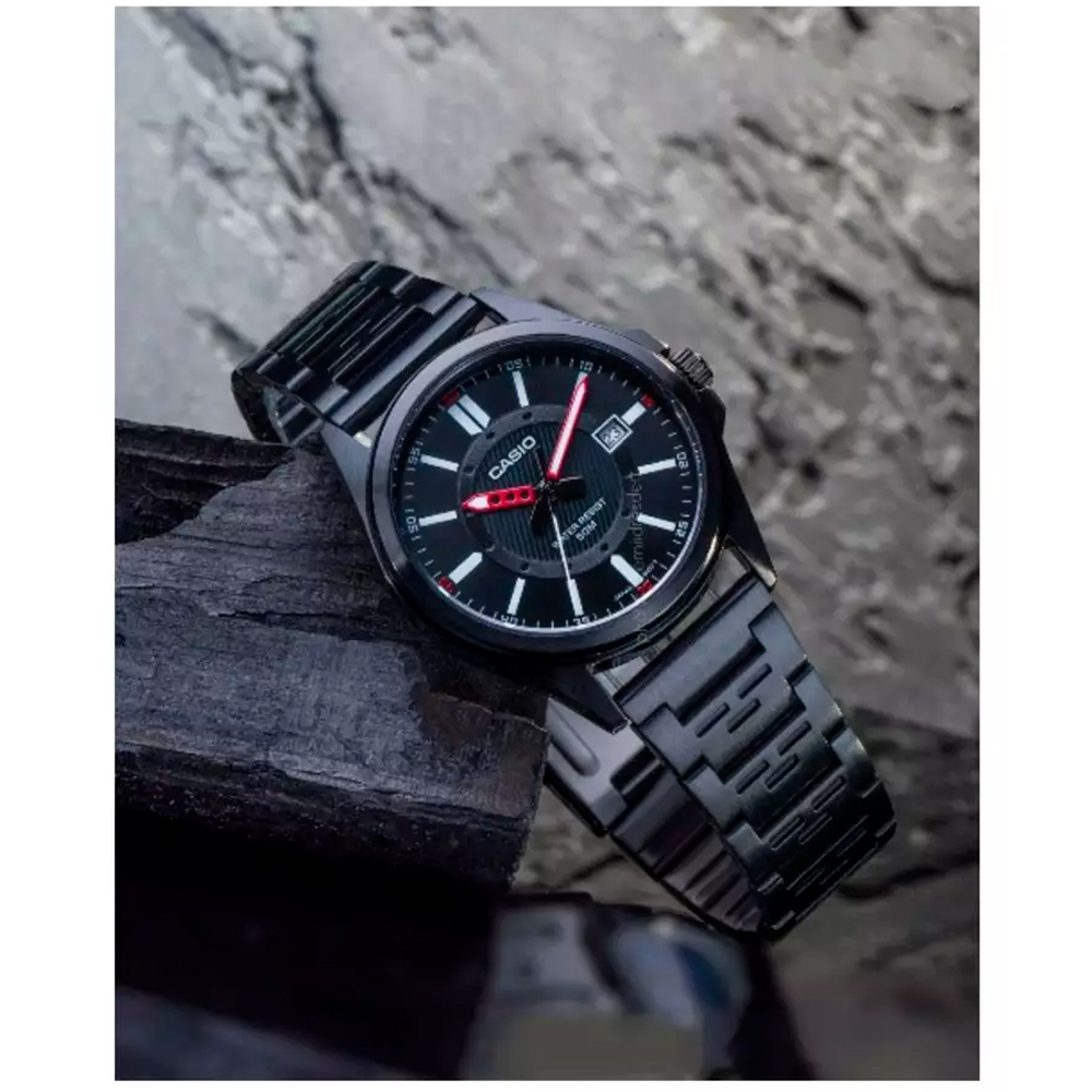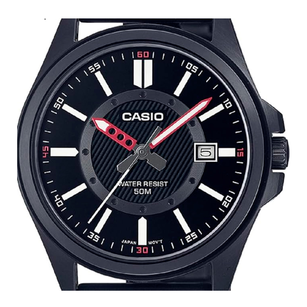 O MTP-E700B-1EVDF é meticulosamente desenhado para capturar a essência da masculinidade contemporânea. Seu mostrador preto exala uma aura de mistério e profundidade, enquanto os marcadores de hora e os ponteiros são cuidadosamente trabalhados para garantir legibilidade imediata em qualquer situação. A caixa de aço inoxidável, robusta e durável, protege o mecanismo interno com uma confiança inabalável, prometendo resistir aos desafios do dia a dia.