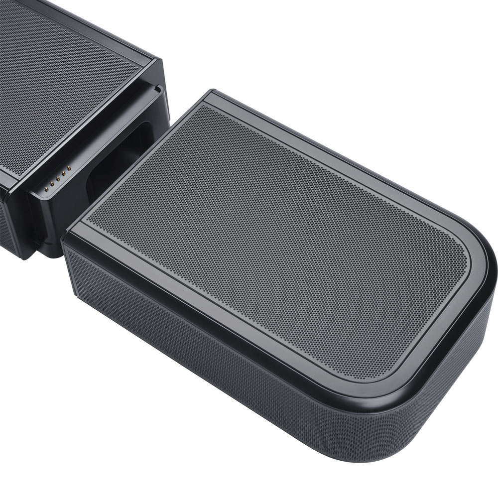 Com o sistema modular da JBL BAR 1300XMK2, você tem total liberdade para adaptar o som ao seu momento. Basta remover as caixas de som sem fio das extremidades da barra e posicioná-las onde quiser. Atrás do sofá, criam um campo sonoro amplo e cinematográfico, ideal para filmes e séries. Mais próximas, oferecem uma atmosfera acolhedora para ouvir músicas, podcasts ou relaxar com playlists de streaming.