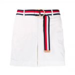 Shorts de cintura alta de algodão elástico branco da Tommy Hilfiger com cós com presilhas, zíper e botões, bolsos laterais, bolso traseiro e cinto removível com assinatura tricolor.